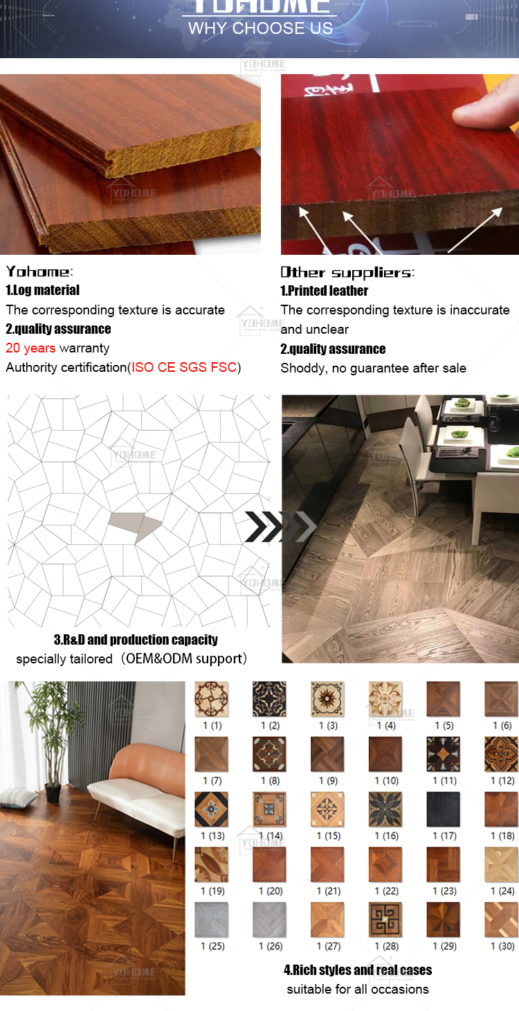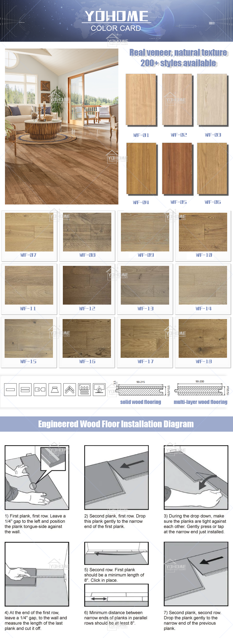 Package preview: Engineered Wood Floor Types: Three-layer/multi-layer laminate flooring size: custom made Wear layer: UV paint payment terms: wire transfer application: bedroom/living room/villa/hotel, indoor model: Oak Series/Black Walnut Series thickness: 12/14/15 or custom Material: oak design...... -