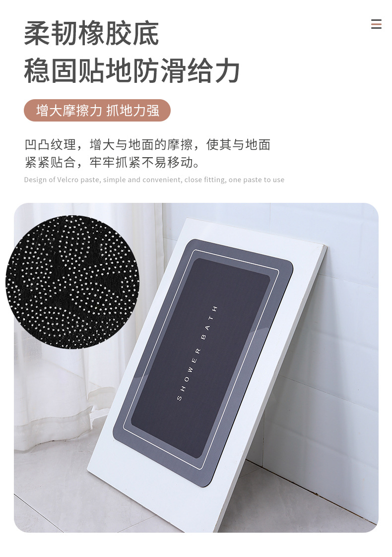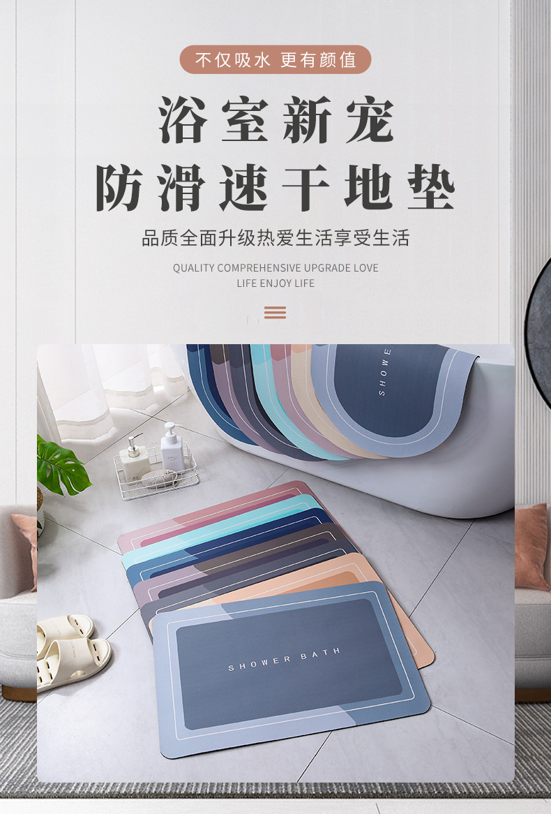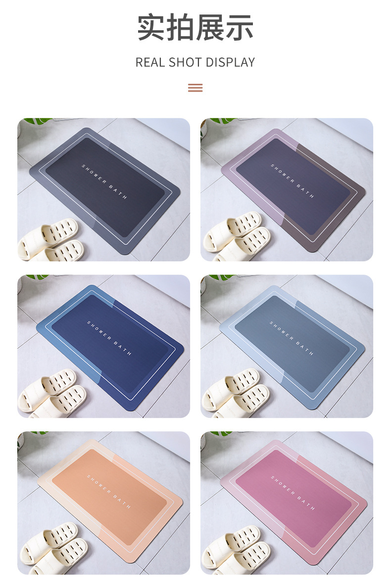 Supply capacity: 50,000 square meters per week product name: bathroom mat pack: OPP bag + carton color: Customized colors Place of origin: China Shanghai Key words: diatomaceous earth bathroom mats,diatomaceous earth bathroom mats,bathroom mats usage: bar, car, door, floor, outdoor, prayer, living..... -