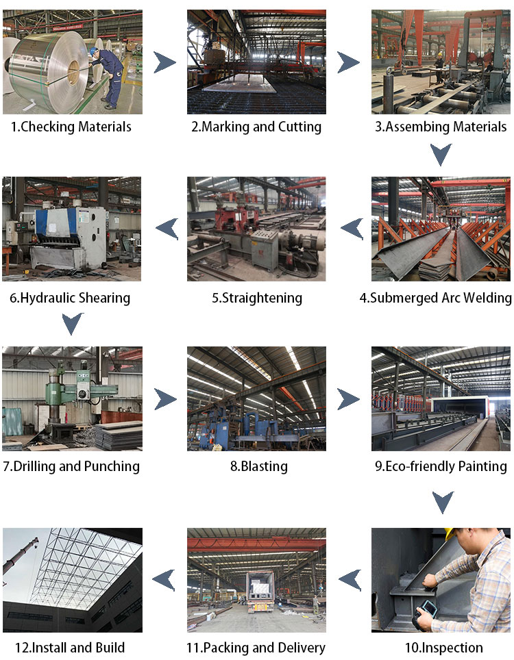 3) Dorian Group has 5 mechanical, electronic, hydraulic, CNC and other high-tech light and heavy steel production lines, which are used to design and produce steel structure buildings with various cutting surfaces and complex curve shapes.
