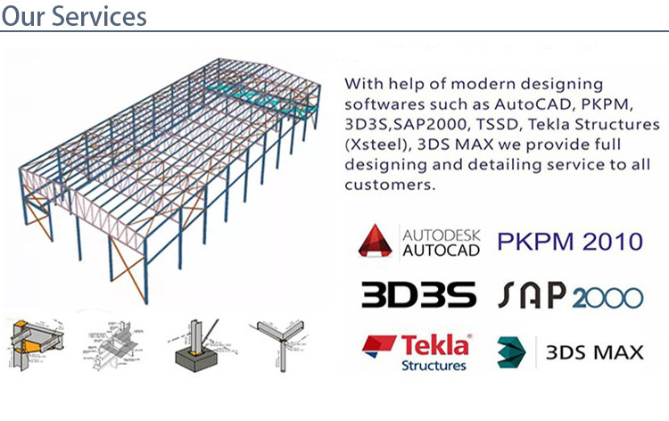 By using professional design software, we can design complex industrial buildings according to customer requirements, such as warehouses, workshops, office buildings, supermarkets, multi-story buildings, hotels, hangars, garages, etc.