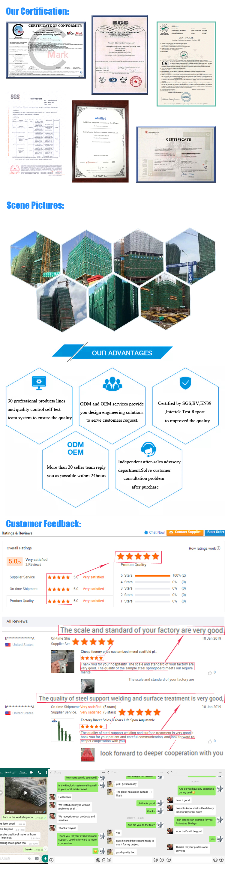 Sheet steel, steel formwork parts, couplers and accessories.established2012Floor area35000 square metersIn Guangzhou, we provide various scaffolding products and services. we have more than30 professional product lines.Production capacity exceeds5000 tons per month.Formed a factory integrating development, design, production and sales to provide you with one-stop engineering solutions, we acceptOEM and ODM.Provide qualified products that pass the following certificationsSGS, BV, EN39, intertek test report, local test report.Strict quality control ensures product quality. In China we have3 factoriesLocated in Tianjin, Dongguan and Foshan. our productssold all over the worldSuch as America Australia, Europe, Middle East and Africa etc.