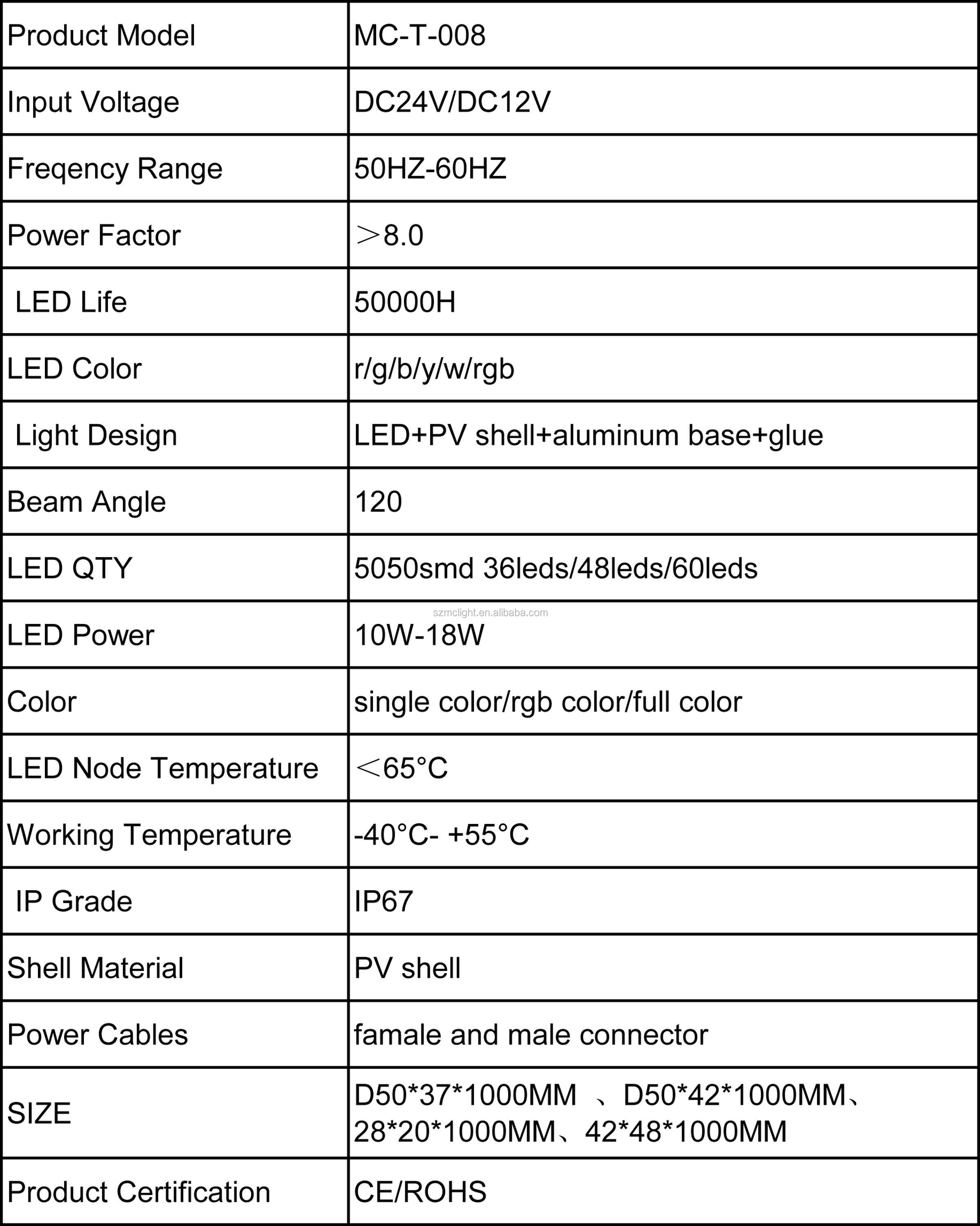 diameter: 20-30MM Working life (hours): 50000 Lighting Solutions Services: Lighting and Circuit Design Luminous efficacy (lm/w): 18 Protection class: IP65 payment terms: L/C, T/T Light body material: pvc Item Type: Light strip, RGB light tube Working temperature(℃): -25 - 50 Lamp luminous flux...... -