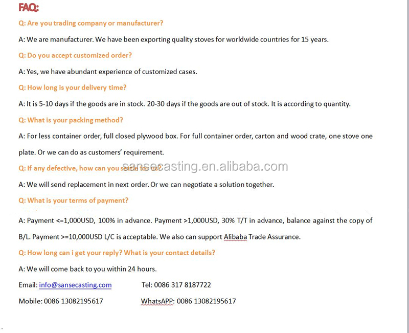 Our factory covers an area of 100,000 square meters, including a construction area of 80,000 square meters. There are two electric furnaces, two sand cleaning machines and two casting production lines. Our factory is capable of producing any casting products. Our main products are sand casting, cast iron stoves, cast iron fireplaces, cast iron stove parts, fireplace parts, cast iron grate chimney fitting kits and all cast iron products. 100% of our products are exported to the whole Europe, America, Hong Kong and Taiwan area. We manage our company with CE certificate. Our aim is: quality first.