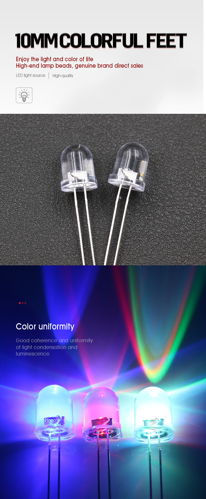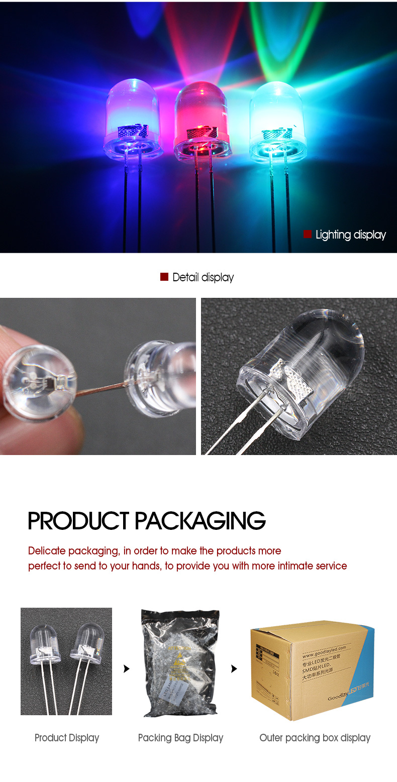 | Packaging Details: | 10MM round head, colorful fast and slow flashing, long feet, a pack of 1000pcs, packed in an electrostatic bag | Forward current: | 2.0mA |
