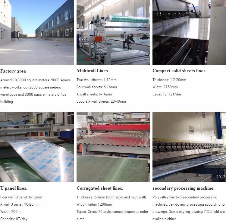 Polyvalley Technology is a professional polycarbonate sheet manufacturer, focusing on using only 100% brand new BAYER or GE raw materials to manufacture high quality PC sheets with at least 50 micrograms of uv coating on one side. Multi-layer sheet T-shaped die head includes two-wall panels, four-wall panels, X-wall panels, double-X wall panels, etc.