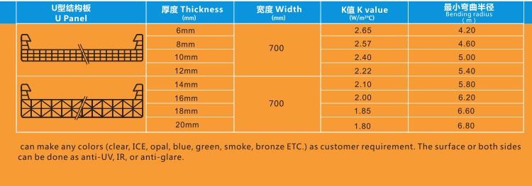The U-shaped panel is developed by Polyvalley, which has the advantages of 100% waterproof, easy installation, high light transmission, heat insulation, and impact resistance. There is a special space between the connecting parts of the two panels. Therefore, the entire long slab can be used in large-span buildings without worrying about thermal expansion. Polyvalley offers a full line of installation accessories and technical support.