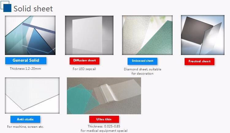 Name Solid polycarbonate sheet Material 100% original Bayer or SABIC color Transparent, blue, lake blue, green, bronze, opal or customized thickness 1mm~20mm standard width 1.22m, 1.56m, 1.82m, 2.1m, 2.3m or can be customized standard length 2.44m. 30m or can be customized surface UV production,...... -