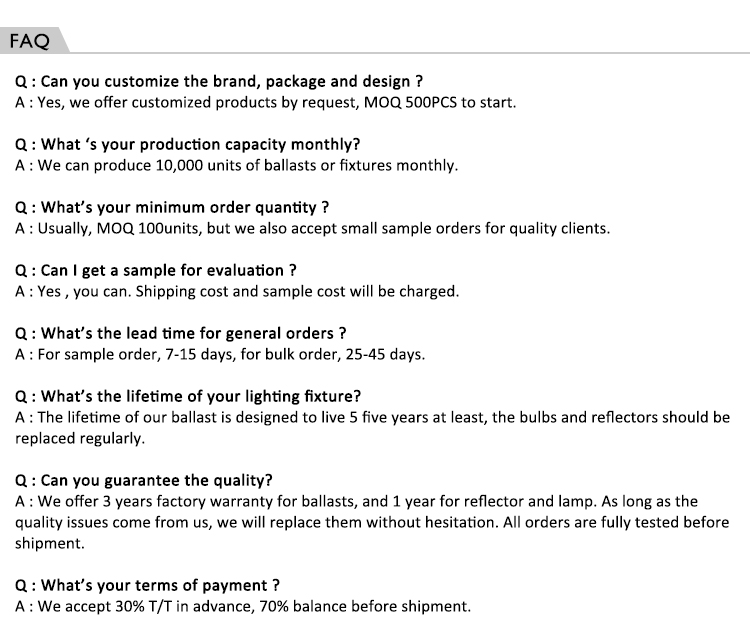 Input voltage (V): AC 220V(±10%) Warranty (year): 1 year Life: 24000 serial number. : HPS Average Lifespan: 18000 payment terms: L/C, Western Union, D/P, D/A, T/T, MoneyGram Color rendering index: 65 Supported dimmers: No Bulb Type: ETC Origin: Jiangsu, China Rated voltage: 150 Luminous flux: 28000.... -