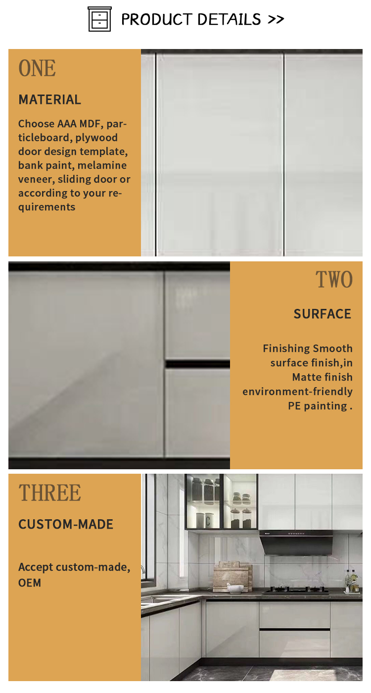 Door surface treatment: Acrylic, varnish, PVC film, solid wood, melamine finish Accessories: Backsplashes, drawer baskets, drawer slides Countertop Material: Marble, Granite, Artificial Stone Wood Type: other Packaging Details: 1. Flat packing: each panel is scanned before packing and can be...... -