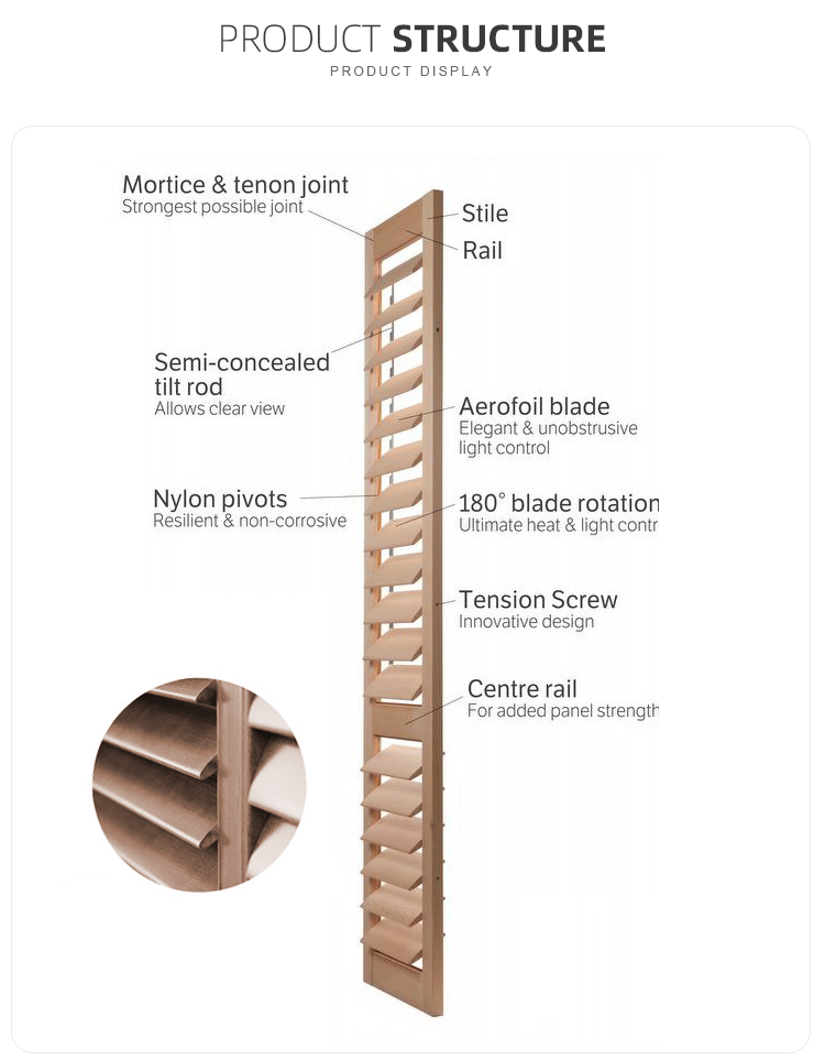 | structure | Solid basswood shutters with laminate to resist warping |