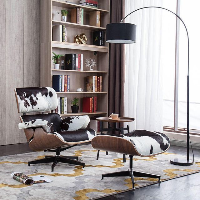 Classic Curved Plywood Cowhide Leisure Office Chair Plywood Premium Leather Chair and Footstool