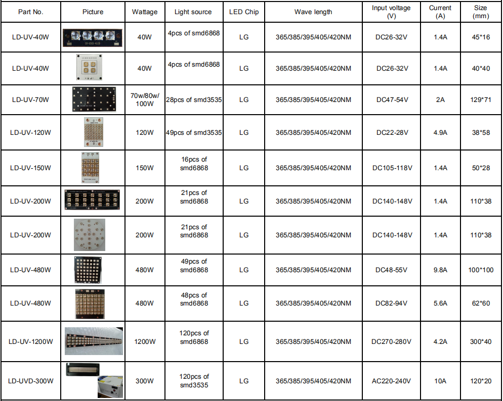Warranty (year): 2 years Power Consumption: 100-8000W (depending on size) Curing time (speed): 0.1-2s (depends on uv material) Origin: Guangdong, China Viewing angle(°): 30/60/120 Dimensions (water cooling A): 72x76XL (L=1-2500mm) Power Consumption: 1000 Supply capacity: 200 pieces per month Chip...... -