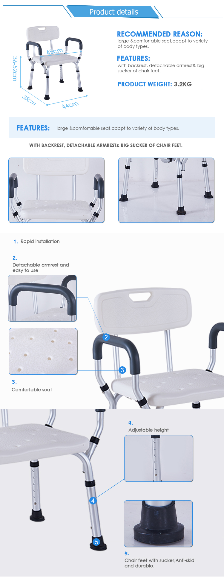 Adjustable Handicapped Bathroom Chair With Detachable Armrest Medical Seat Aluminum Shower Stool