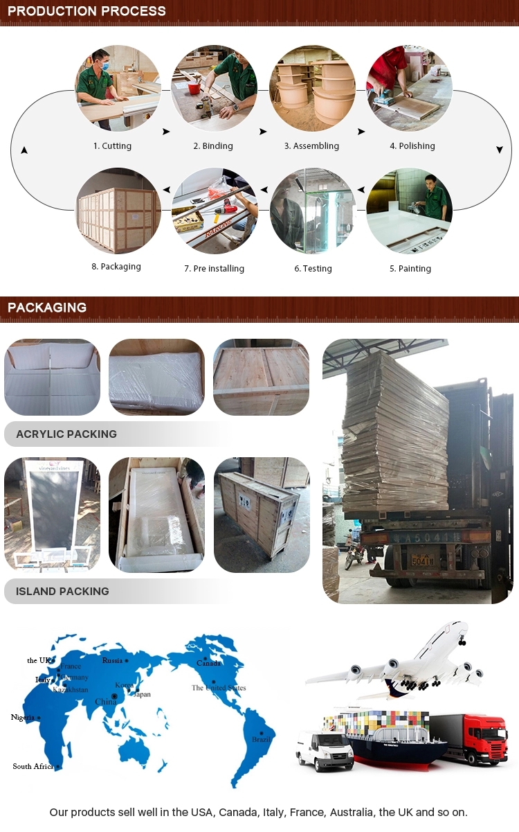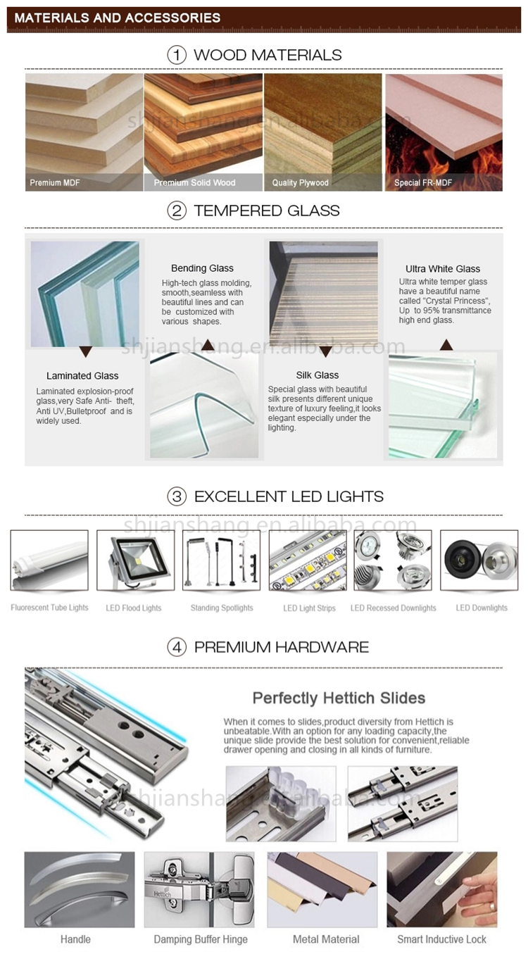 Our commonly used materials are: MDF, wood veneer, baking paint, tempered glass, acrylic, stainless steel, aluminum alloy, lighting, etc. Our materials are all environmentally friendly.
