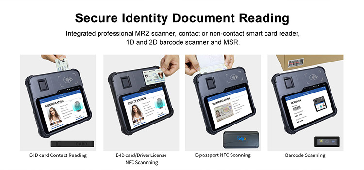 Integrated professional MRZ scanner, contact/contactless smart card reader, fingerprint sensor, iris recognition, facial recognition camera, 1D and 2D barcode scanner, and MSR.