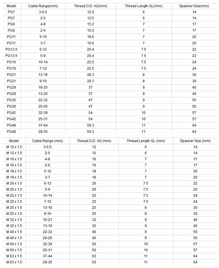 PG7 PG9 PG11 PG13.5 PG16 PG21 PG29 PG36 PG42 PG48 PG63 M12 M16 M18 M20 M22 M25 M32 Nylon Metal Brass Stainless Steel