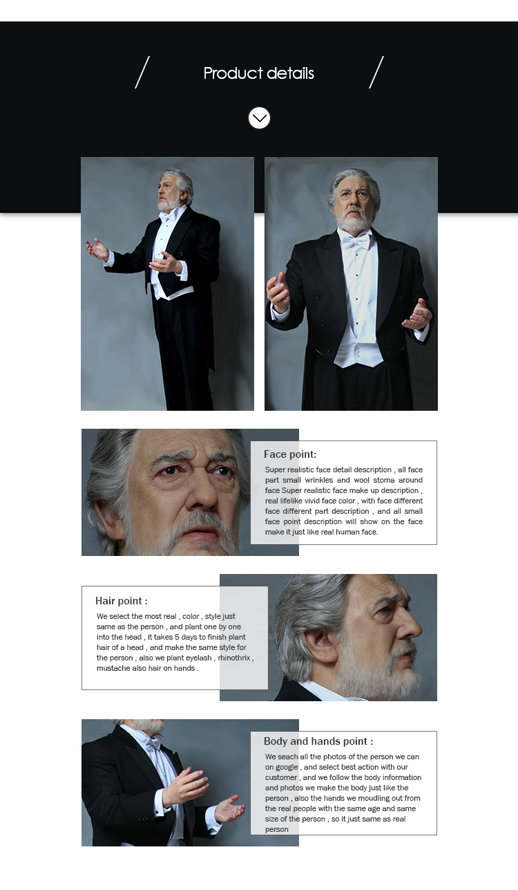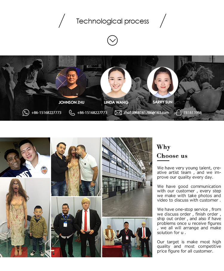 Origin: Zhejiang, China Package: Export standard wooden box Packaging Details: The separated parts are packed in bubble bags, then put into cartons, and then packed in standard export wooden cases. theme: Silicon Wax Statue usage: theme park Technical: hand-made Statue Type: Statue type: statue......