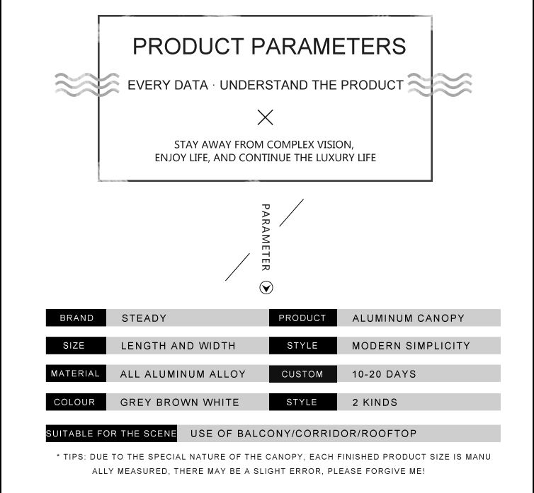 size: Optional, from 2.0*1.5m to 6.0*3.0m color: custom color Material: aluminum alloy MOQ: 5 sets Sail finishing: Professional outdoor dusting Adjustable angle: 5°-45° application: Garden, Terrace, Gazebo, Cafe, Terrace, etc. Function: Waterproof/UV Resistant port: Guangzhou Package preview:...... -