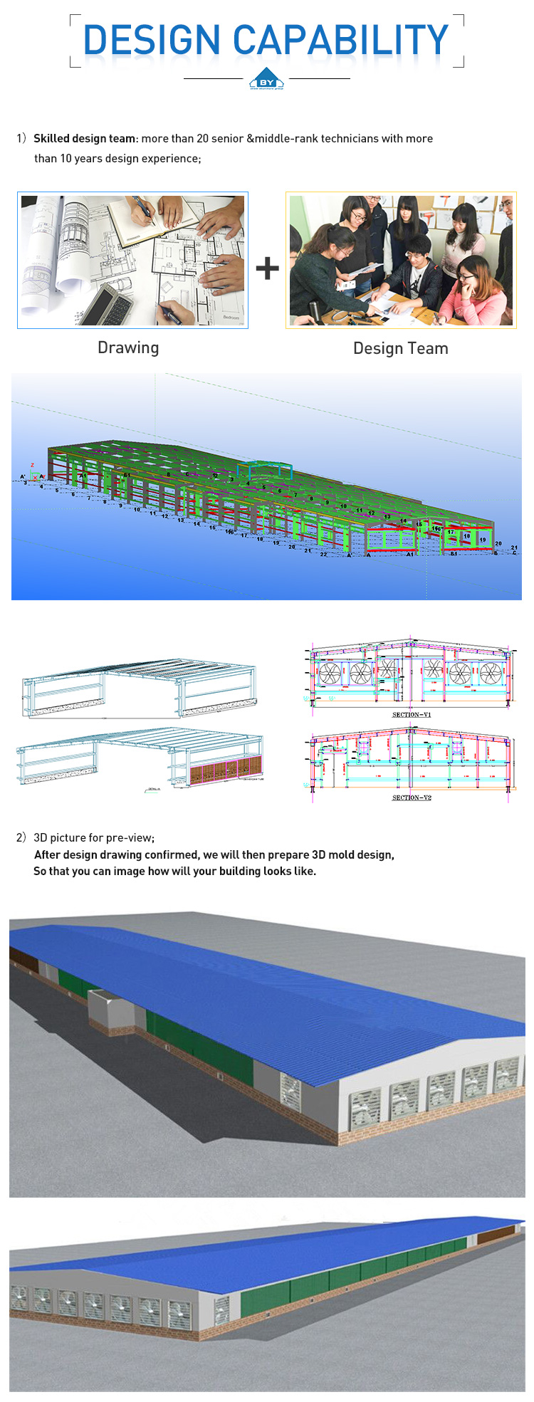 design: Computer Aided Design use: poultry house color: white/blue/red/green Warranty: life type: prefabricated steel structure payment terms: L/C, Western Union, T/T, MoneyGram Door: Roller and sliding doors Packaging Details: According to customer requirements window: Plastic windows and aluminum.... -