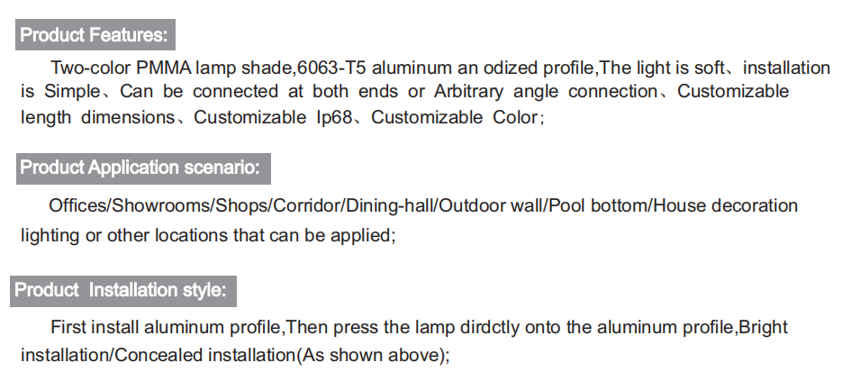 Working life (hours): 50000 Color rendering index (Ra>): 80 product name: milky white strip Beam angle: 360° Packaging Details: carton Warranty (year): 2 channel: RGB Item Type: light tube Lifespan (hours): 50000 application: landscape Input voltage (V): twenty four Supported dimmers: Yes model:......