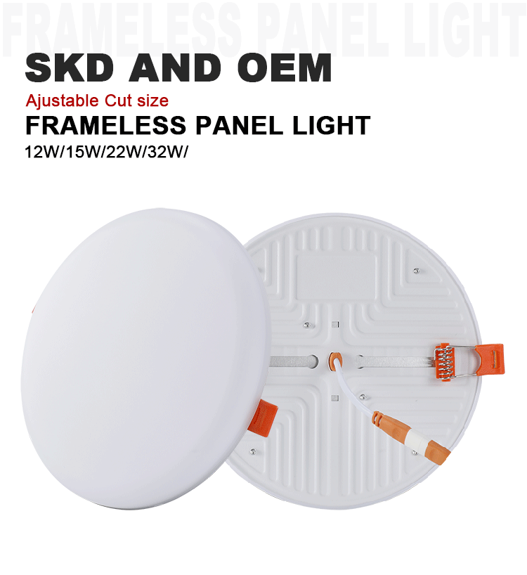 | Frameless-R-24W | 170*170mm | 50-140mm | 24w | 110 lumens/watt | >80 | Acrylic + aluminum. | >0.5 | AC165-265V | round/square |