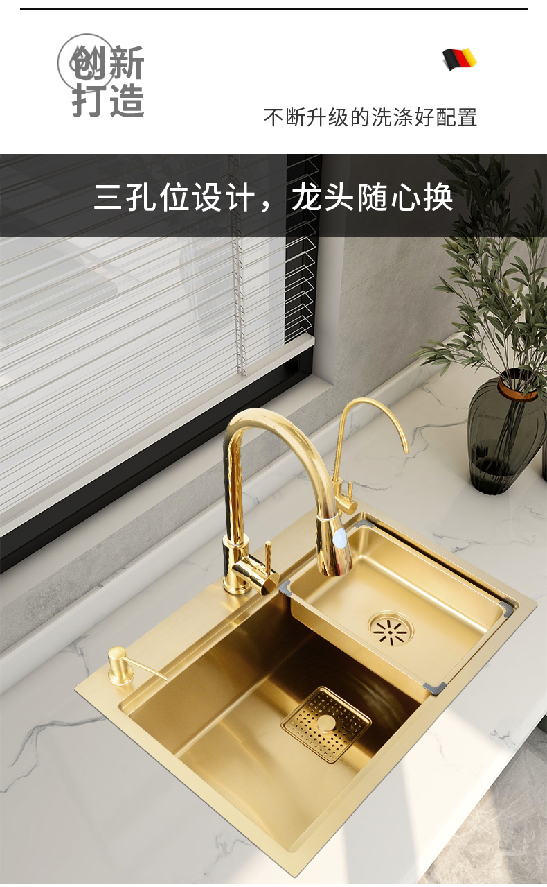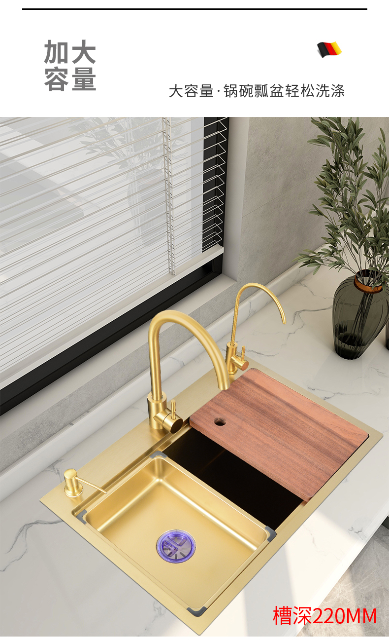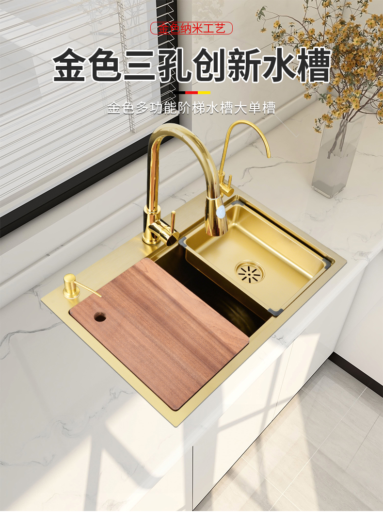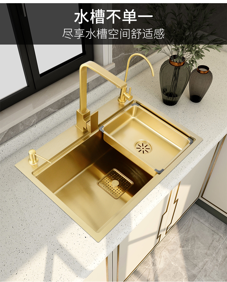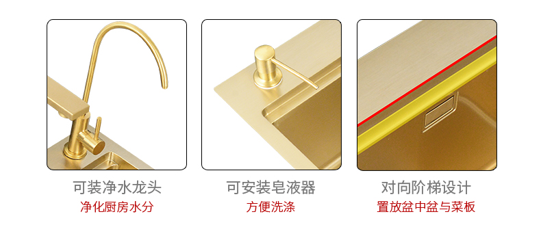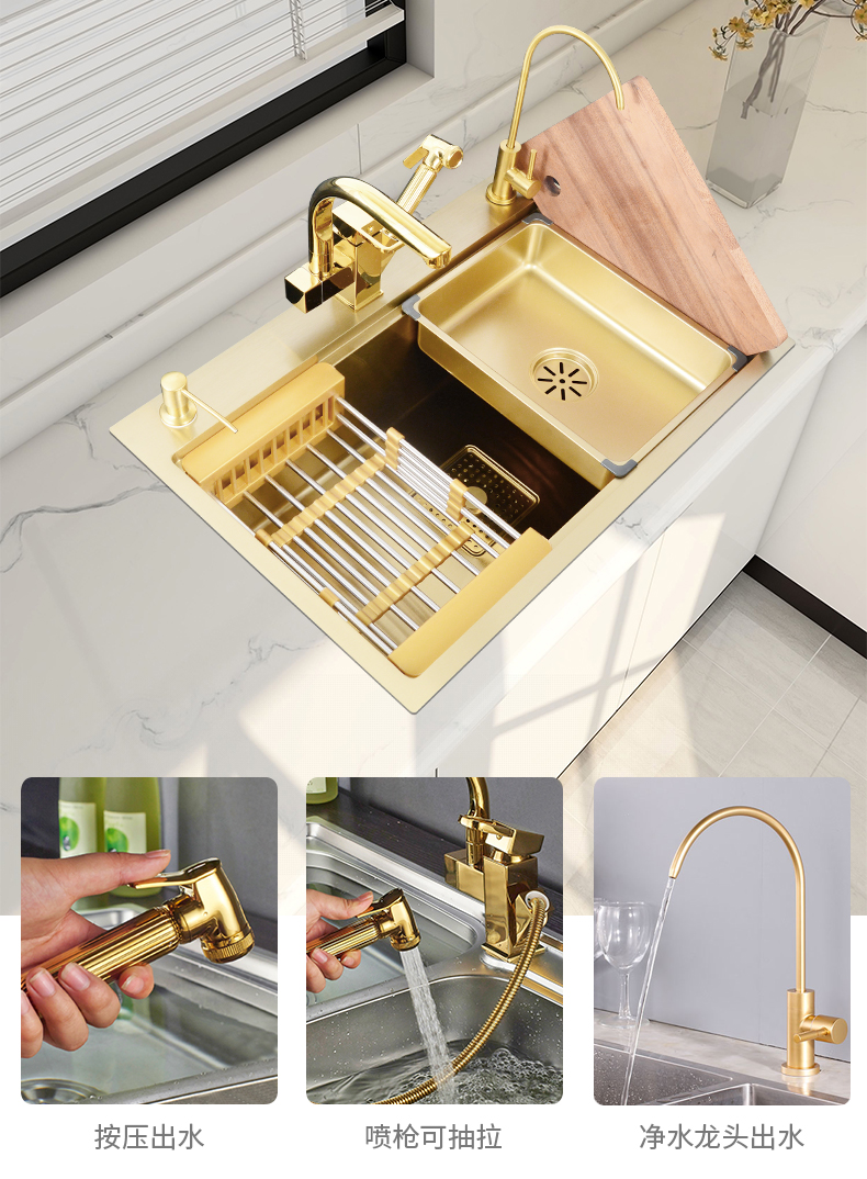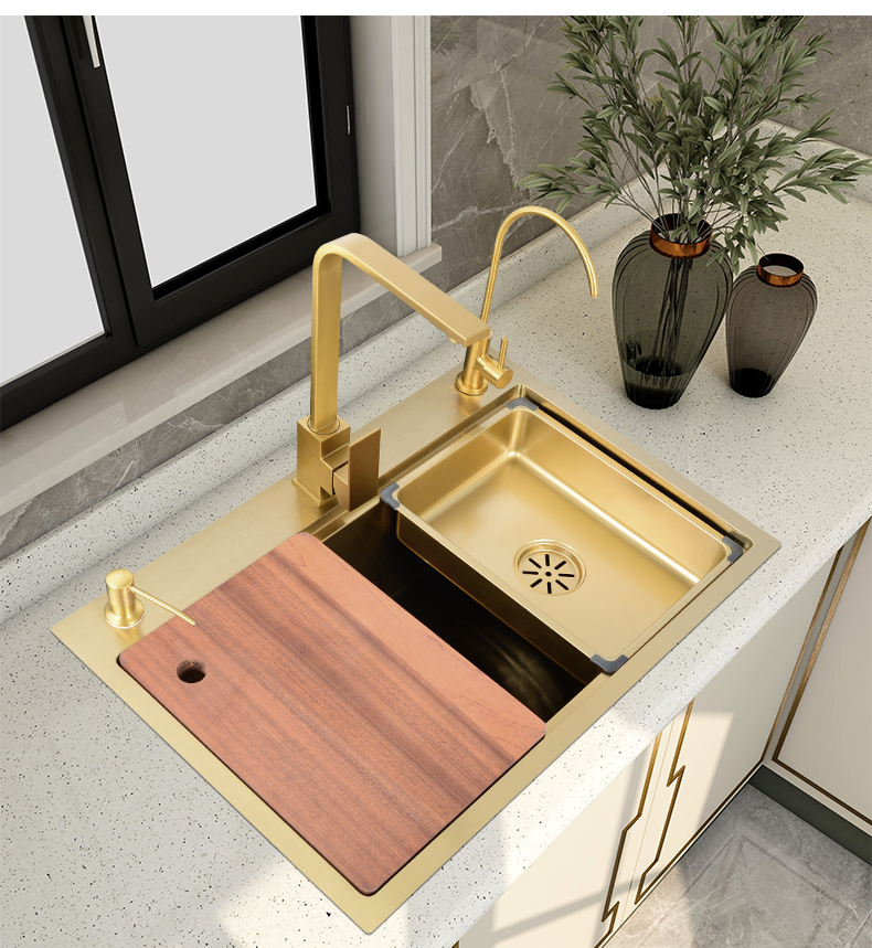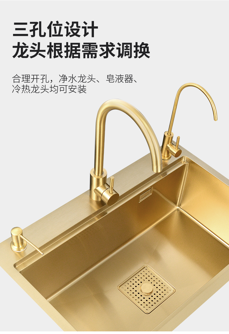 Nano-304 Stainless Steel Sink Large Single Kitchen Sink Gold Brushed Home Sink 3 Hole Faucet Filter Faucet Accessories