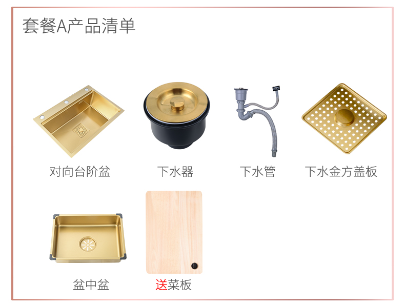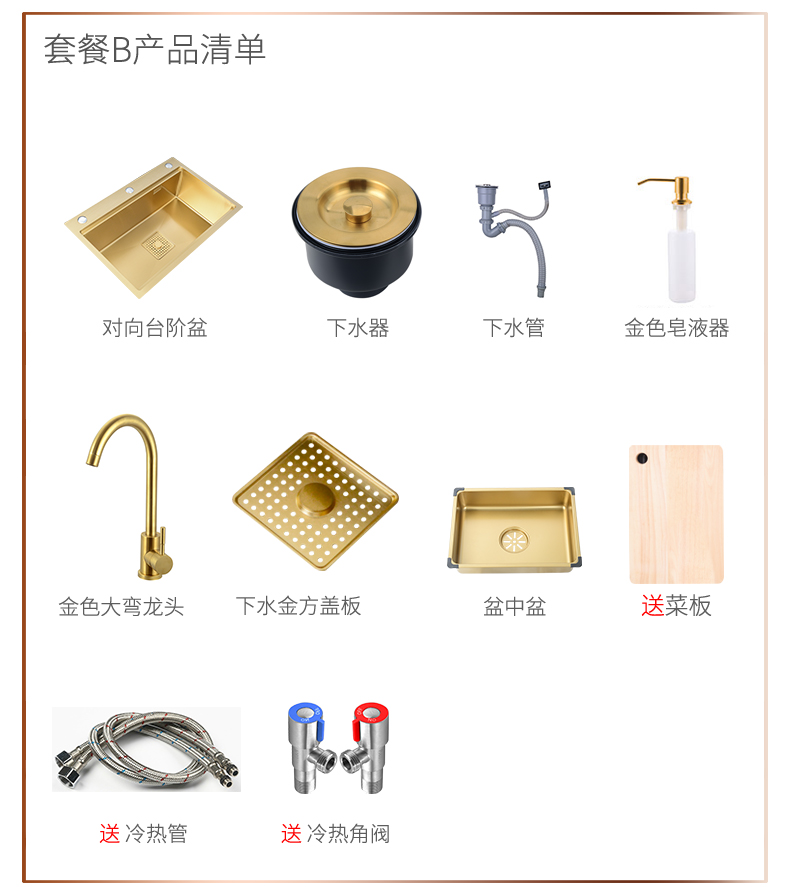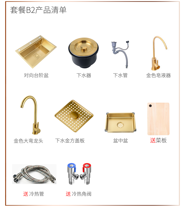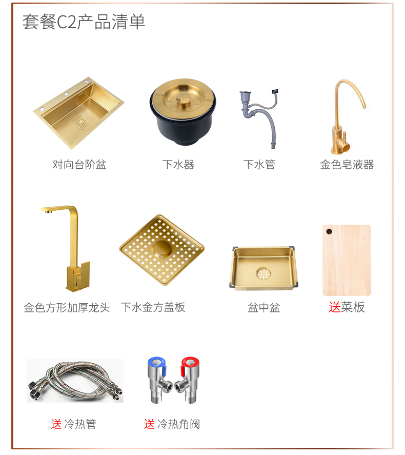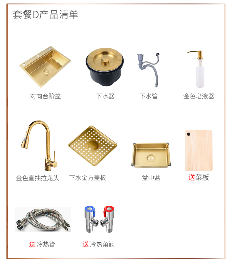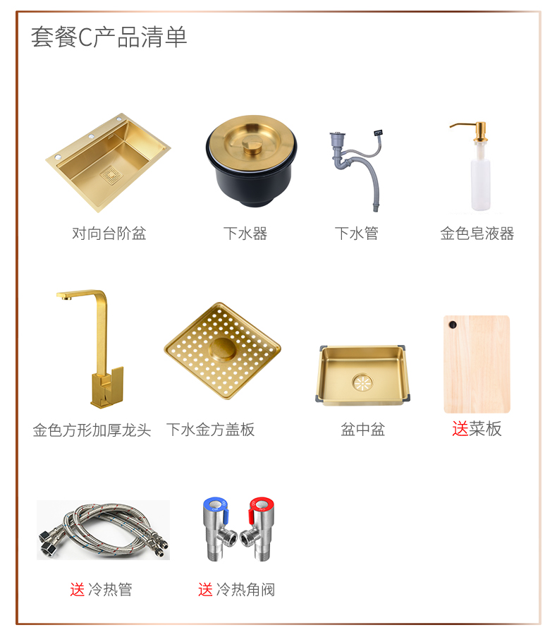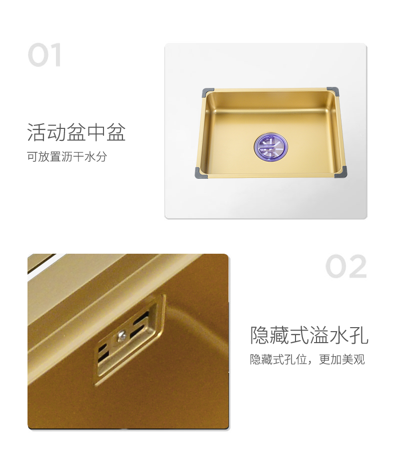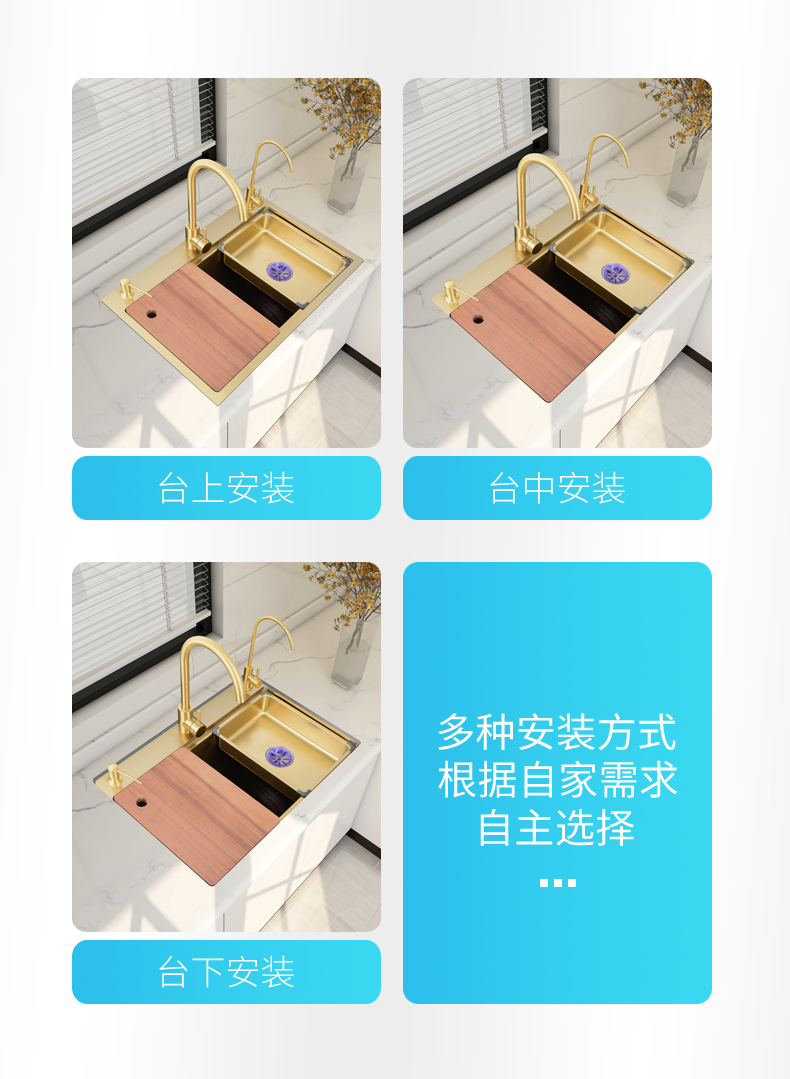 Nano-304 Stainless Steel Sink Large Single Kitchen Sink Gold Brushed Home Sink 3 Hole Faucet Filter Faucet Accessories