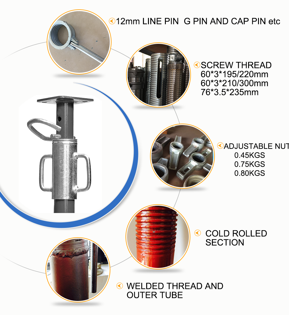 model: adjustable props pin: G needle design style: industrial Surface treatment: Powder coating, HDP, pre-galvanized, electro-galvanized, painted weight: 7-30kg Certificate: ISO9001:2008 brand: Tiantian Group Packaging Details: According to customer requirements Material: construction scaffolding..... -