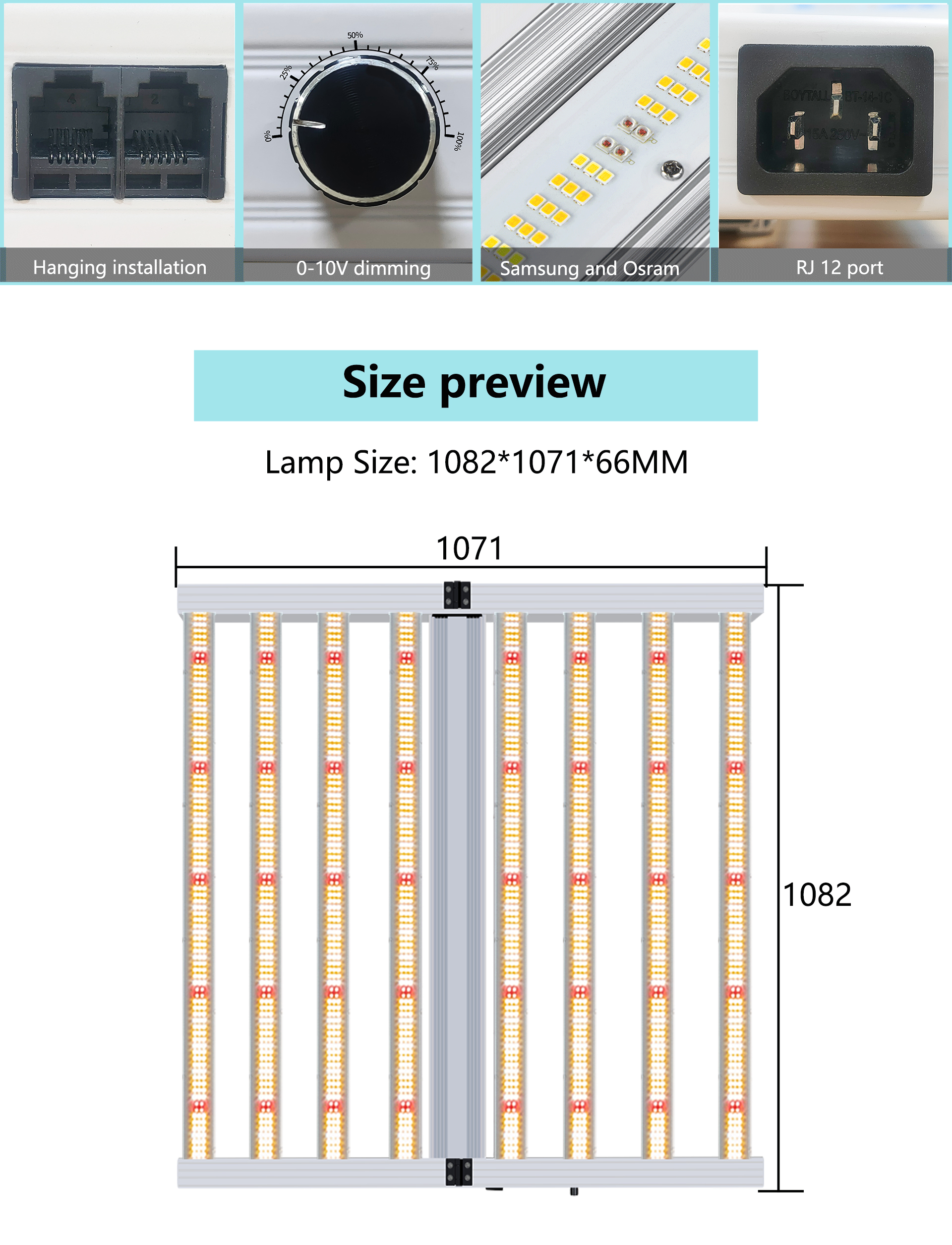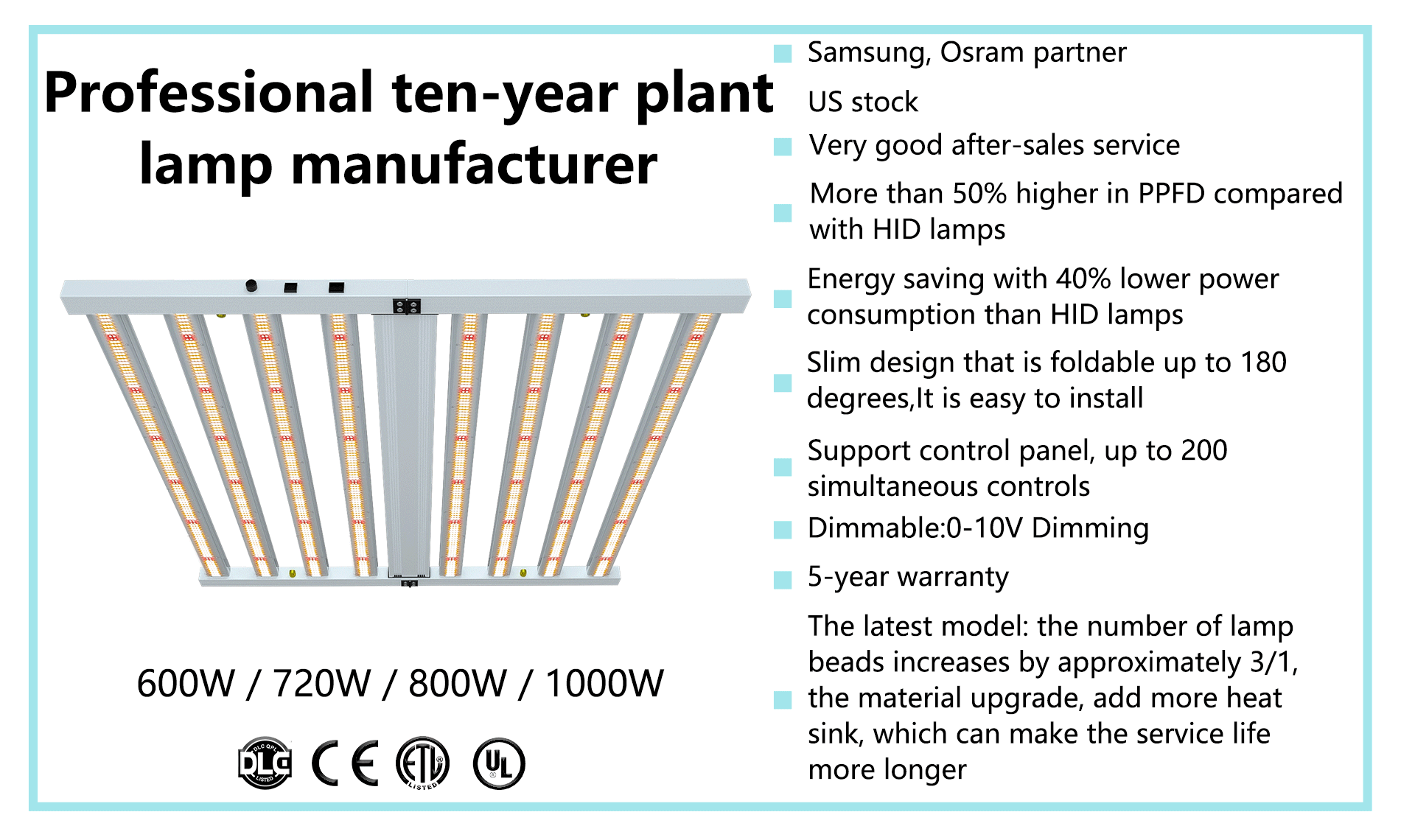 Dimming: 1-10V custom made: Different spectra can be provided according to different plants Luminous efficiency (μmol/J): 2.5 PPFDμmol/(m2 s): 1000-2000 Expedition: 2.5 micromol/joule strength: 600W Product weight (kg): 14 Input voltage (V): 100-277VAC Supply capacity: 1000 sets per week light...... -
