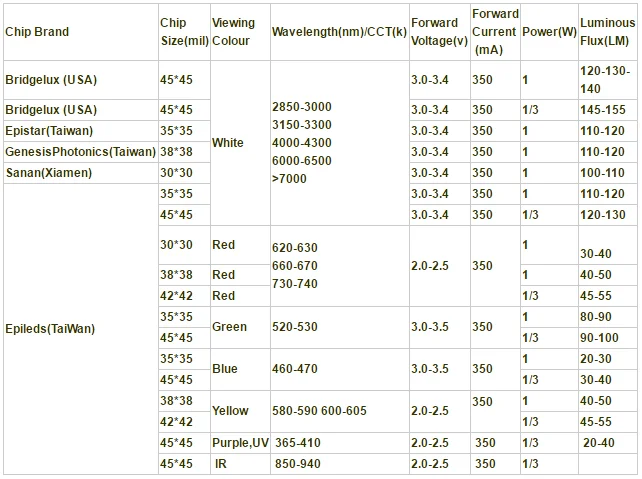 Color temperature (correlated color temperature): 3000K-15000K strength: 1W, 1-2W, 2W, 1-3W, others, 1-500W Wavelength 2: 440nm 460nm 490nm 520nm 590nm 620nm 660nm 730nm 850nm 940nm Wavelength 1: 365nm 370nm 375nm 380nm 385nm 390nm 395nm 400nm 405nm 410nm 425nm port: Shenzhen, China Color...... -