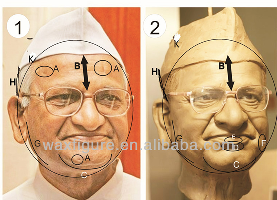 A: Please mark the points to be modified on the real person and the clay draft, as shown in the figure below.