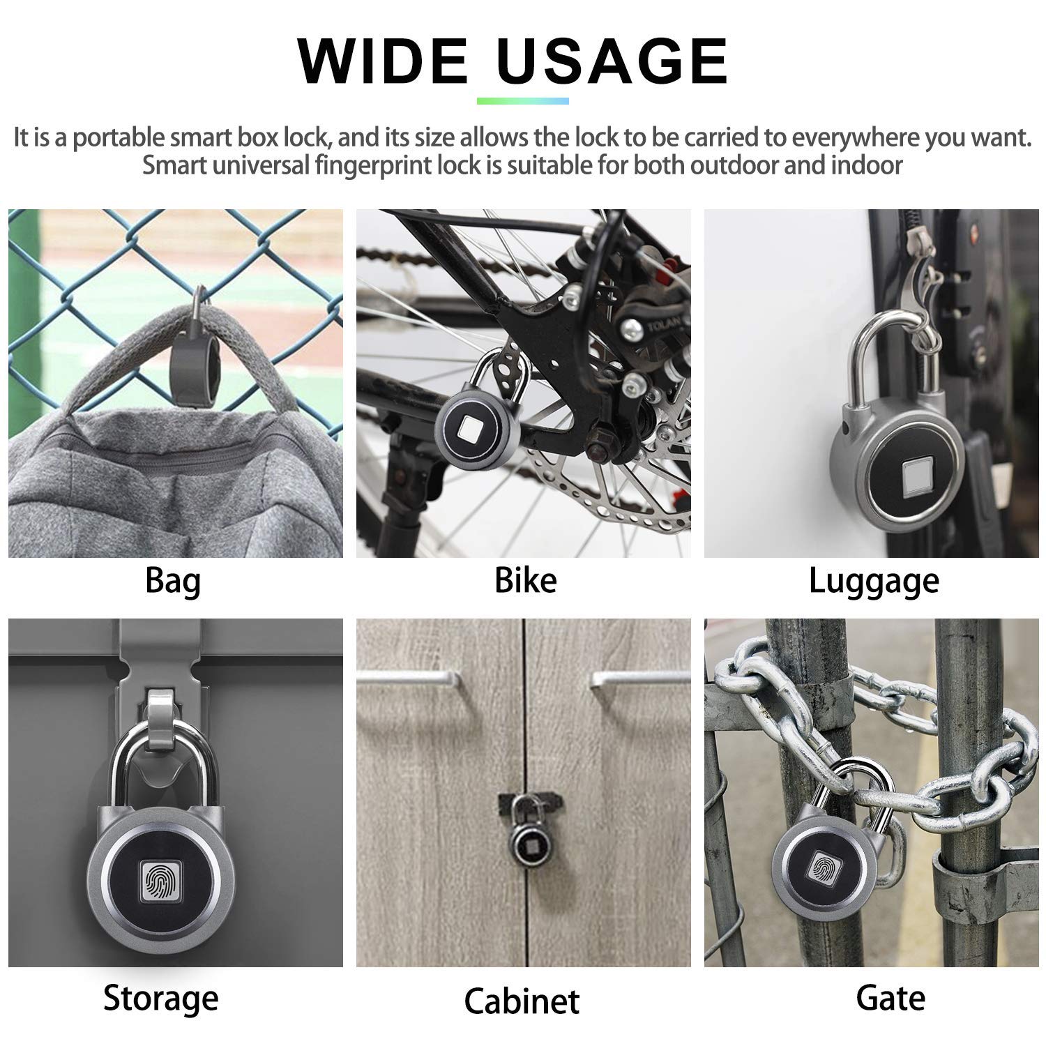 - [Lightweight, Portable and Versatile]: The gym lock is small enough to be carried anywhere. ROEY Fingerprint BLE padlocks are suitable for indoor and temporary outdoor use in gyms, schools, offices, doors, gates, fences, garages, warehouses, cabinets, sheds, suitcases, handbags, luggage, bicycles, etc. Not suitable for outdoor use in rain or snow.