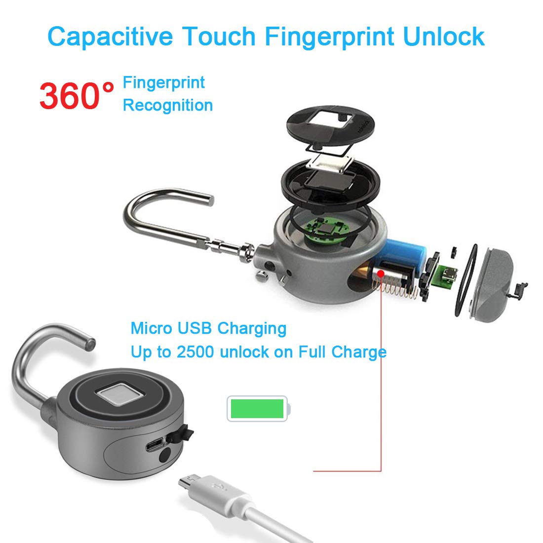 - [Long Running Time]: ROEY smart padlock has lower power consumption and longer standby time. The USB rechargeable 150MAH lithium battery can support up to 6 months of standby time or 2 months (2500 unlocks) on a single charge. When the battery is dead, the smart lock will stay locked, just connect the USB power to restore.