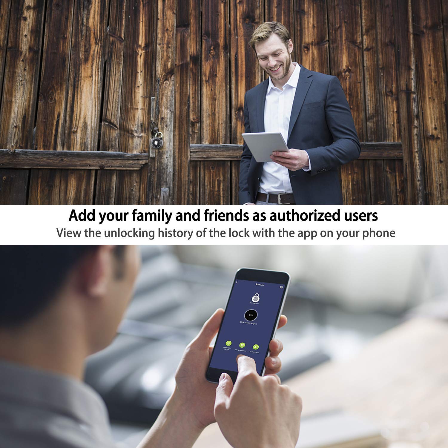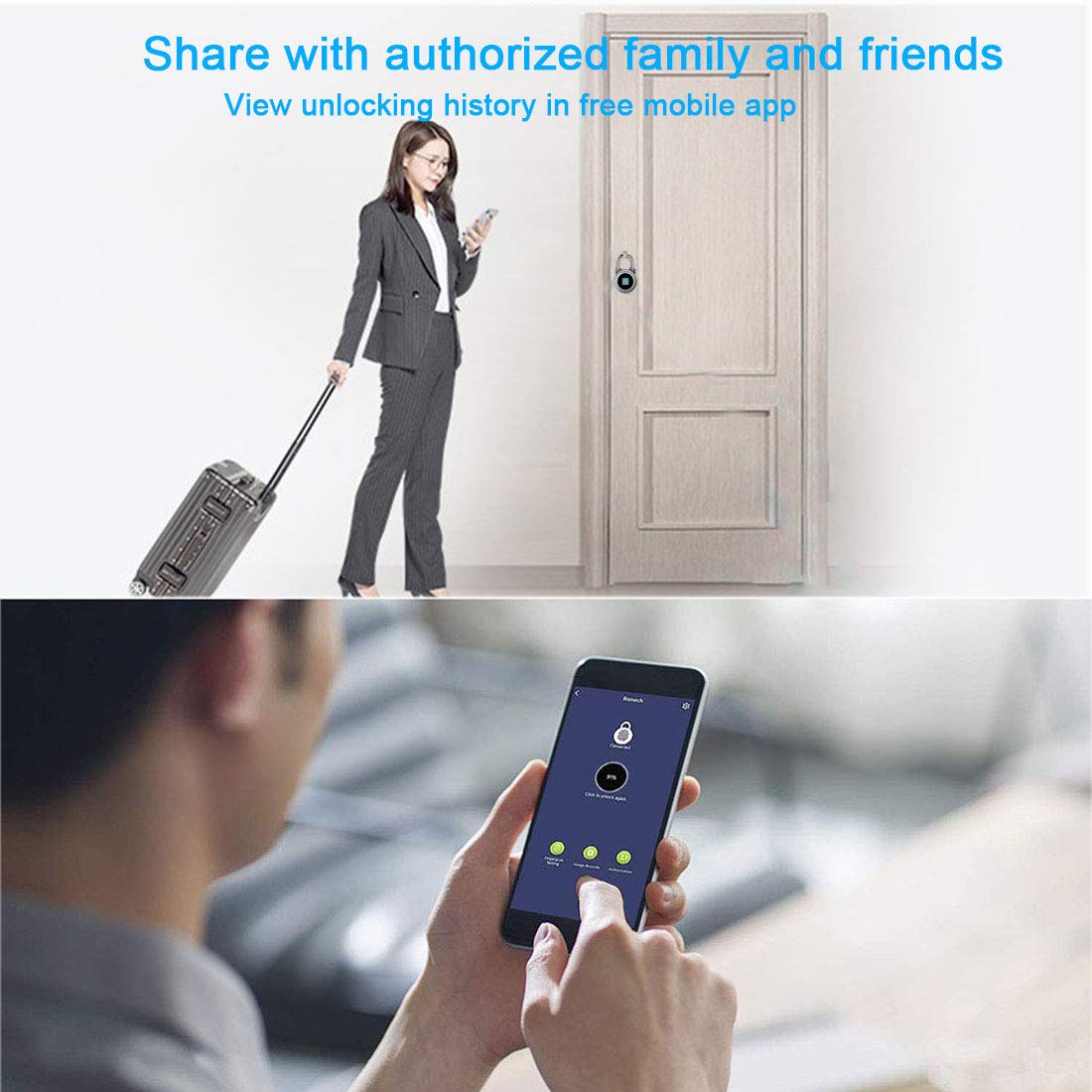 - [BLE Function]: Connect the smart padlock to the free mobile app via BLE. You can use the app for fingerprint registration, unlocking, setting up authorized users, checking the last 1000 unlocking activities, etc.