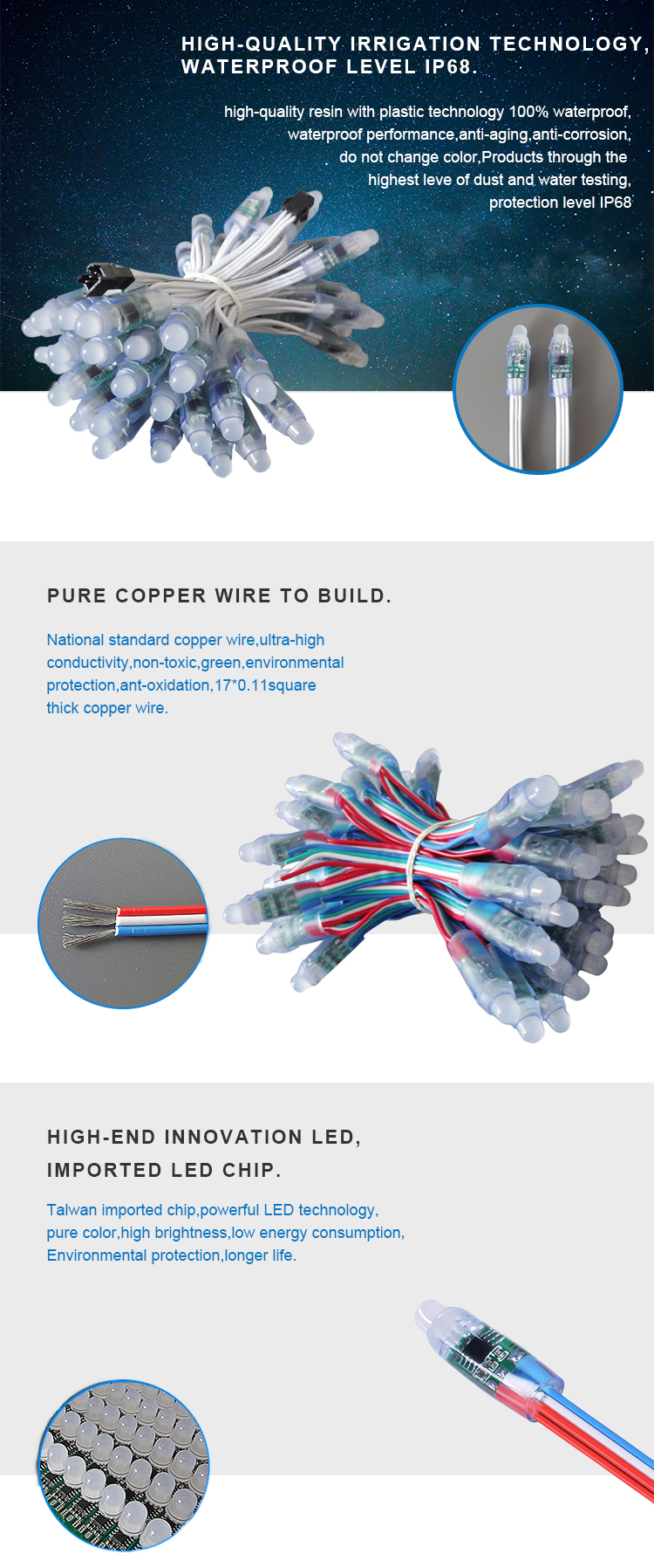 light source: to lead Color rendering index (Ra): 80 model: IL-P12V5WS2811/UCS1903 Lifespan (hours): 50000 Light body material: pvc brand: Istar LED Protection class: IP67 waterproof port: Shenzhen Supply capacity: 50000pcs 12mm ws2811 pixel LED lights per week Working temperature(℃): -20 - 50...... -