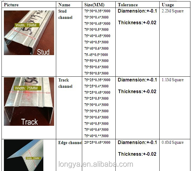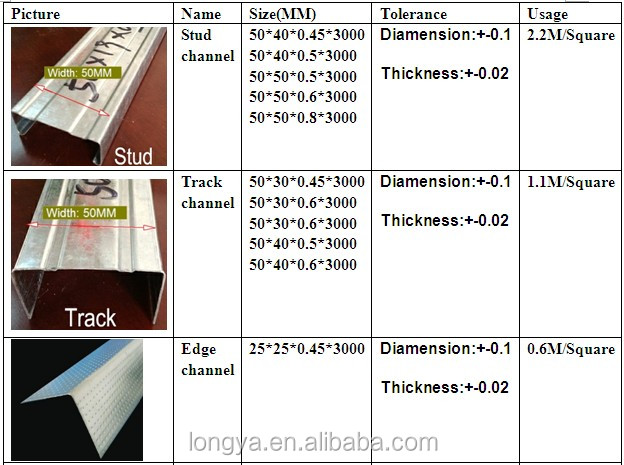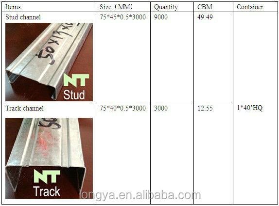 | Packaging Details: | Gypsum board metal posts and tracks; 2pcs in bundles, 26TON/20FT | 5. Height of metal slide rail: | 25mm, 30mm, 35mm, 40mm, 45mm |