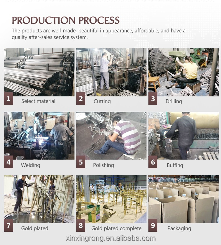 Foshan Xinxingrong Furniture Manufacturing Co., Ltd. was established in May 2008. It is located in the international furniture manufacturing city-Lecong, Foshan City, Guangdong Province, China. After 10 years of hard work, it has developed from several small workshops at the beginning of its establishment. A staff team of 100 people is now the size of a furniture factory. Specializing in the production of stainless steel dining table sets, stainless steel dining tables, stainless steel sofas and chairs. Hotel bar chairs, etc. The monthly production capacity is 5000 sets. Xinxingrong Furniture Company has excellent professional and technical personnel and management elites. Adopt scientific management methods and advanced processing equipment. The products produced by our company are affordable, quality guaranteed, and delivered on time, and are exported to Europe, America, the Middle East, Africa, India and many other countries in the world. And maintain a long-term cooperative relationship. Xinxingrong Furniture Co., Ltd. adheres to the principle of integrity and win-win situation, and makes better service and more refined, updated and more fashionable products. We are willing to cooperate with global furniture buyers to make progress and develop together.