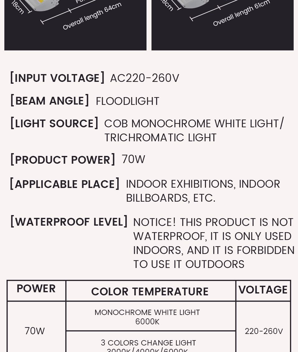 Application: Indoor billboards, advertising signboard stick shovel lights, indoor exhibition lights, booth lights, stadiums and other indoor places.