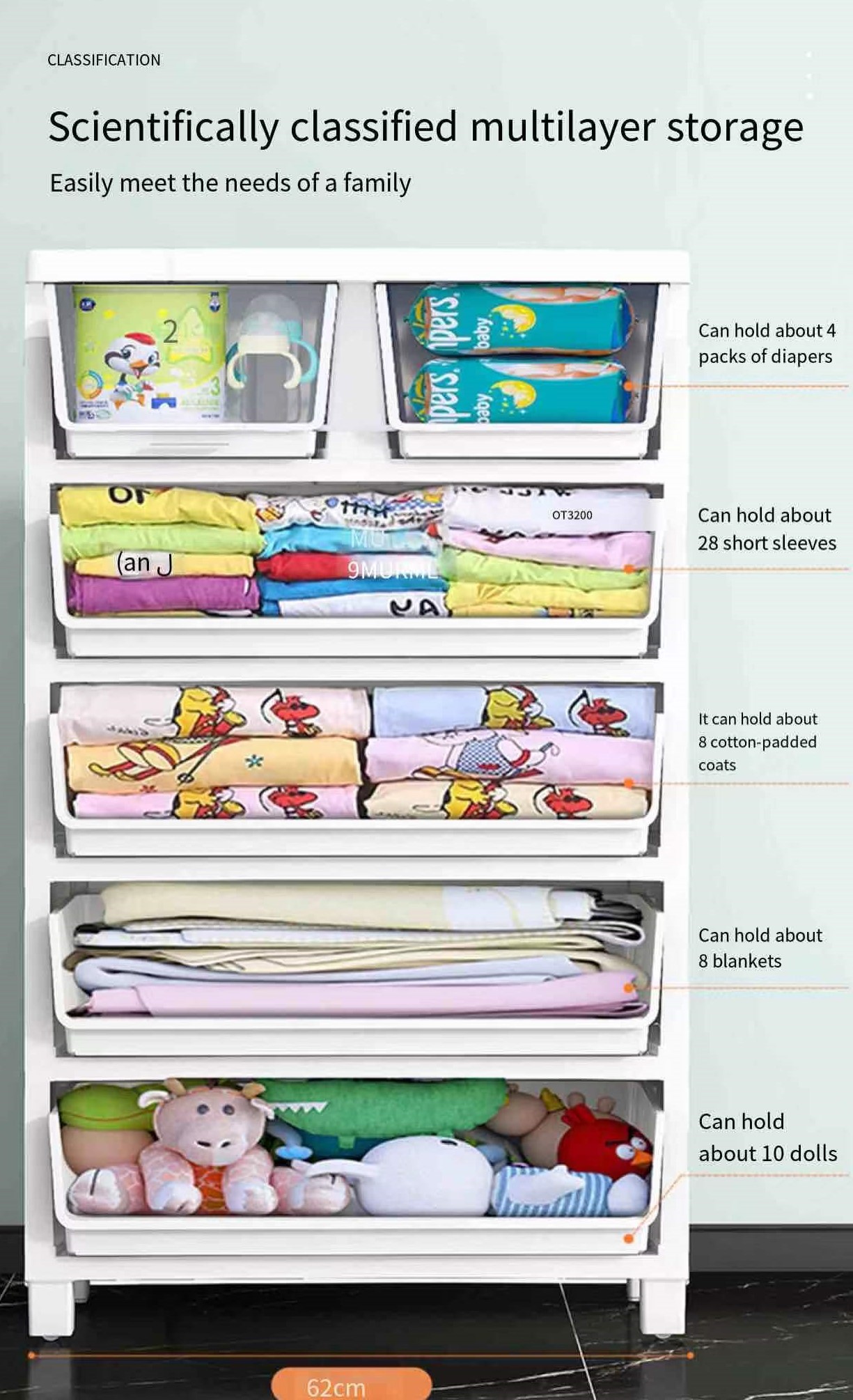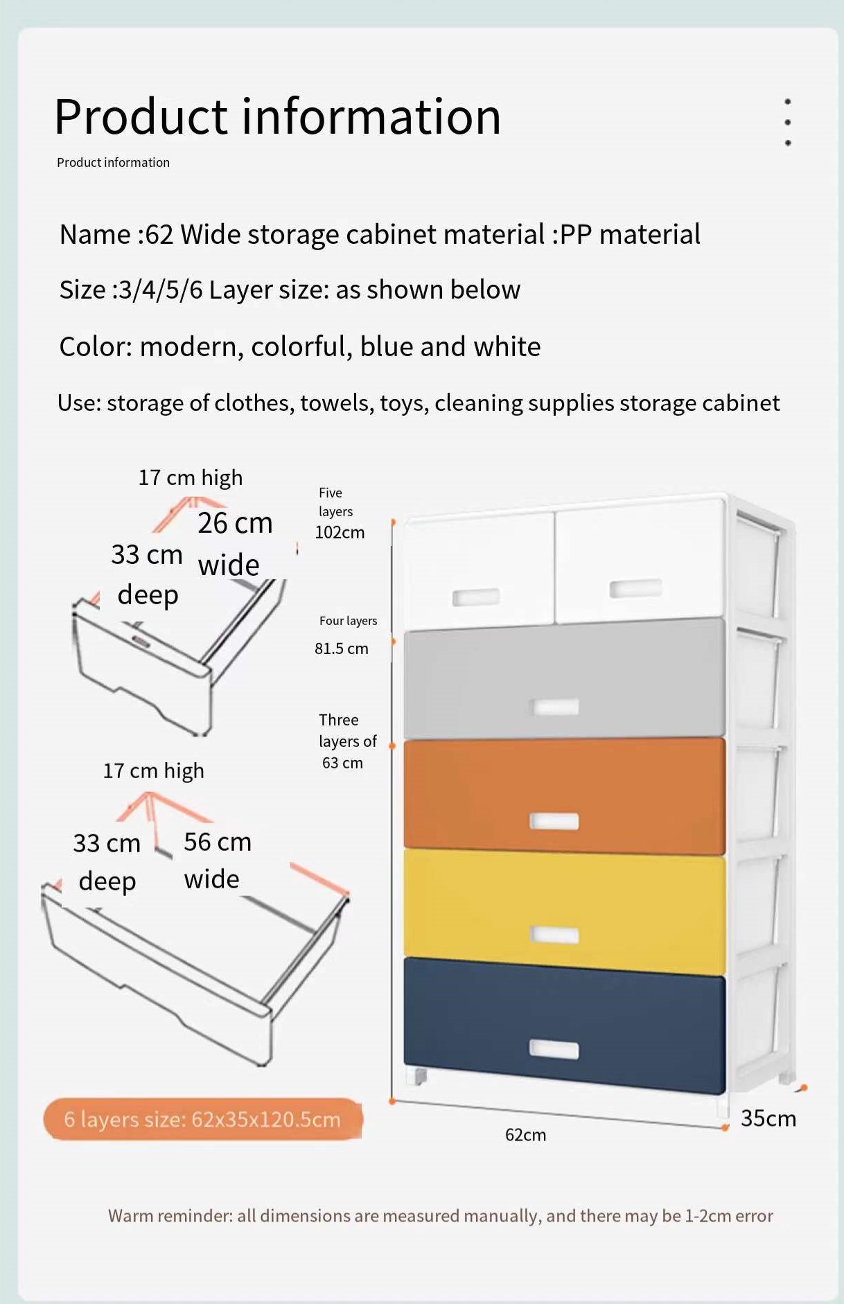 layer: 3-7 floors OEMs and Design Manufacturers: acceptable Package: 1 piece/carton describe: multifunctional plastic cabinet storage Package: 1 shape: rectangle Specification: 56cm wide Applicable space: living room, wardrobe, bedroom color: Green, blue, gray, pink, khaki feature design:...... -