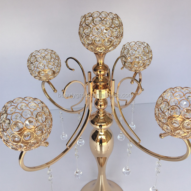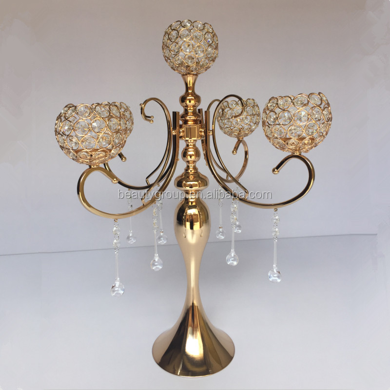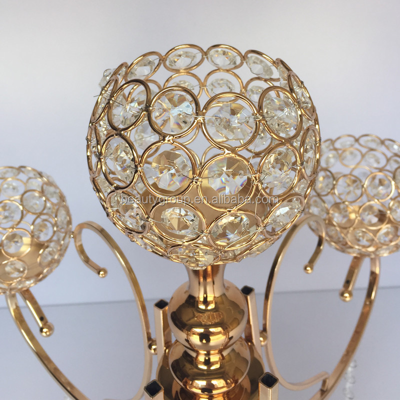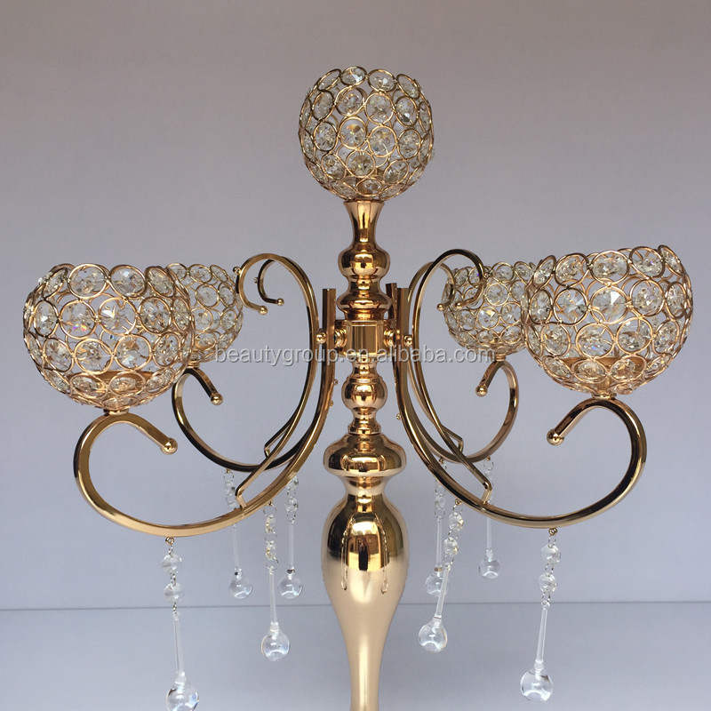 High Quality Sale 5 Arm Luxury Gold Candle Holder, Crystal Centerpieces for Wedding Table