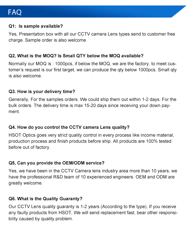 Chief Ray Angle: 25° Package preview: Overall length: 3±0.3 sensor type: 1/6''COMS Mountain: M12*P0.35 flight number: 2.8±10% brand: high temperature superconductivity Origin: Guangdong, China Lens structure: 2P payment terms: L/C, Western Union, T/T focal length: 2.6±5% Maximum image height: 3.3mm.... -
