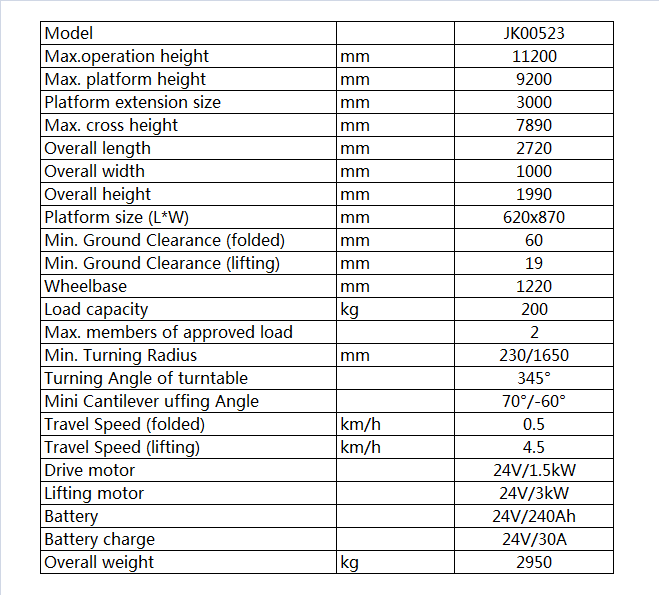 | maximum. Platform height: | 9200mm aerial work platform | model: | JK00523 aerial work platform |