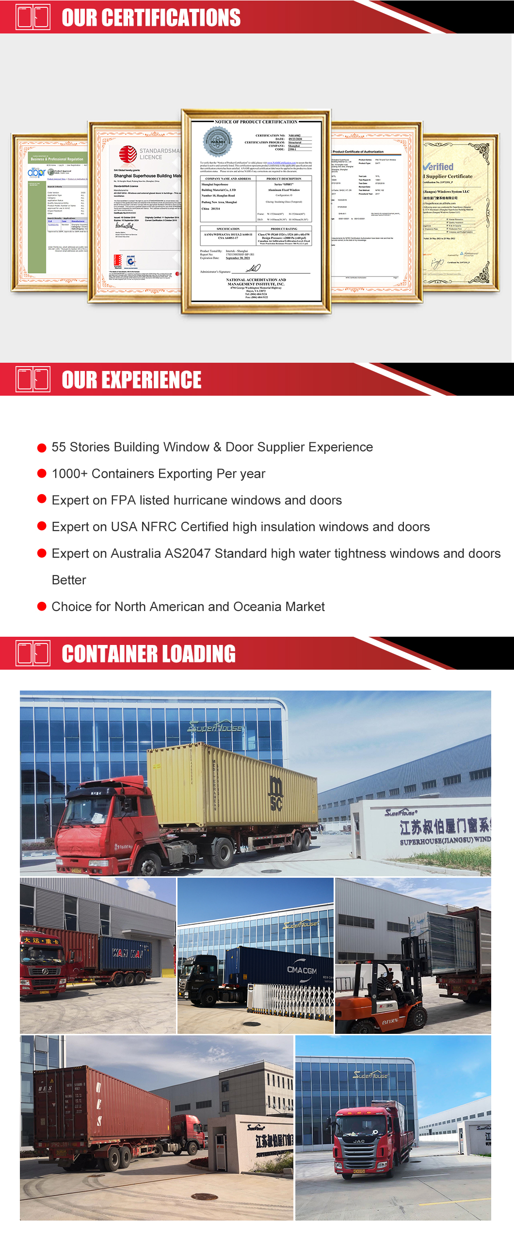 Warranty: over 5 years model: SPA100 Water permeability: meet 450 pa Material: aluminum Packaging Details: Aluminum windows are packaged in: Step1. Protective tape to protect the frame from scratches; Step 2. Fix the window or door on the iron pallet; Step 3, tie the window or door on the iron......