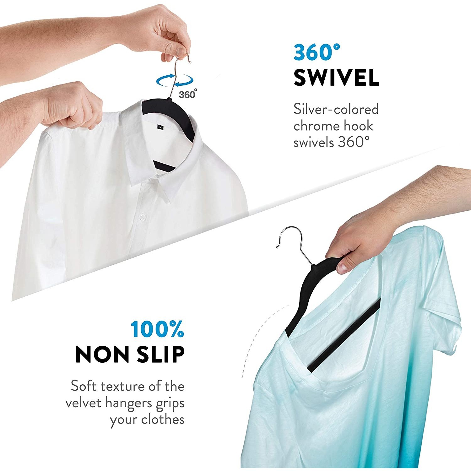Premium flocked velvet provides a smooth and luxurious finish while protecting your clothes and helping to keep your wardrobe organized. The non-slip velvet grips clothes, keeping them on hangers instead of the floor.