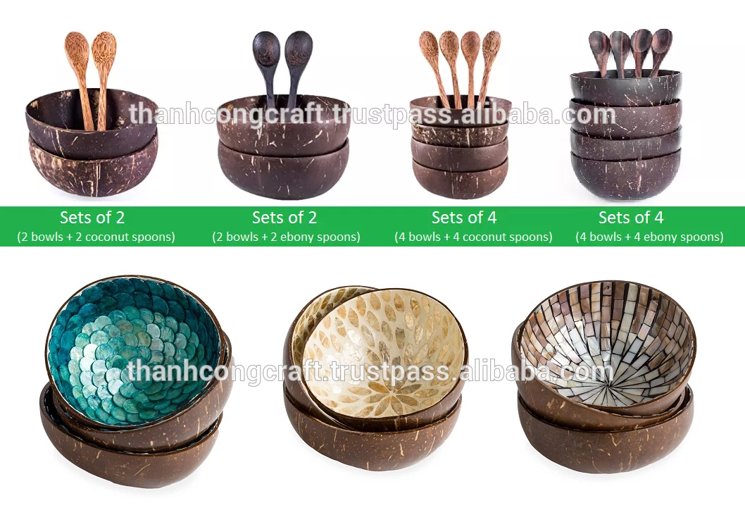 2. Coconut Bowl and Spoon Set / Seashell, Egg Shell Inlaid Coconut Bowl