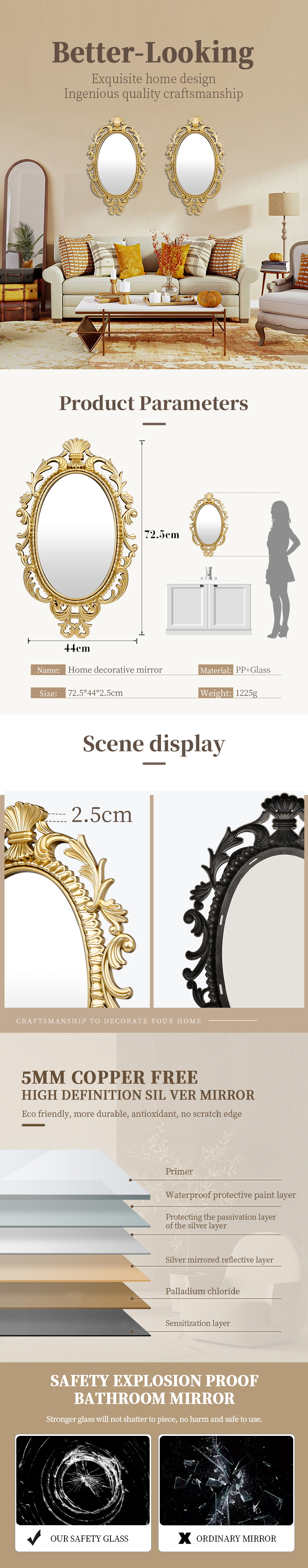 Home Decor Luxury Accessories Simple PP Injection Molded Wall Mirror Decoration Home, Frame Retro Wide Mirror Gold Decoration