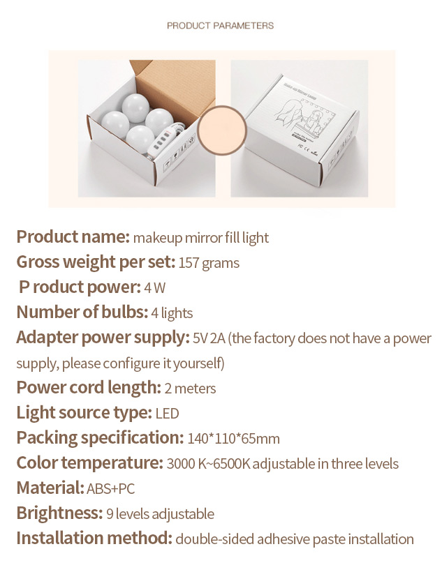 Product Type: Mirror light Origin: China Warranty (years): 1 year light source: Leading Product Description LED light source SMD lamp beads 5V 12V low voltage three-tone lighting makeup mirror bulb Voltage: DC5V/12V Size: 48 mm Power: 1W Color: Warm white+white Packaging and Shipping We will ship...... -