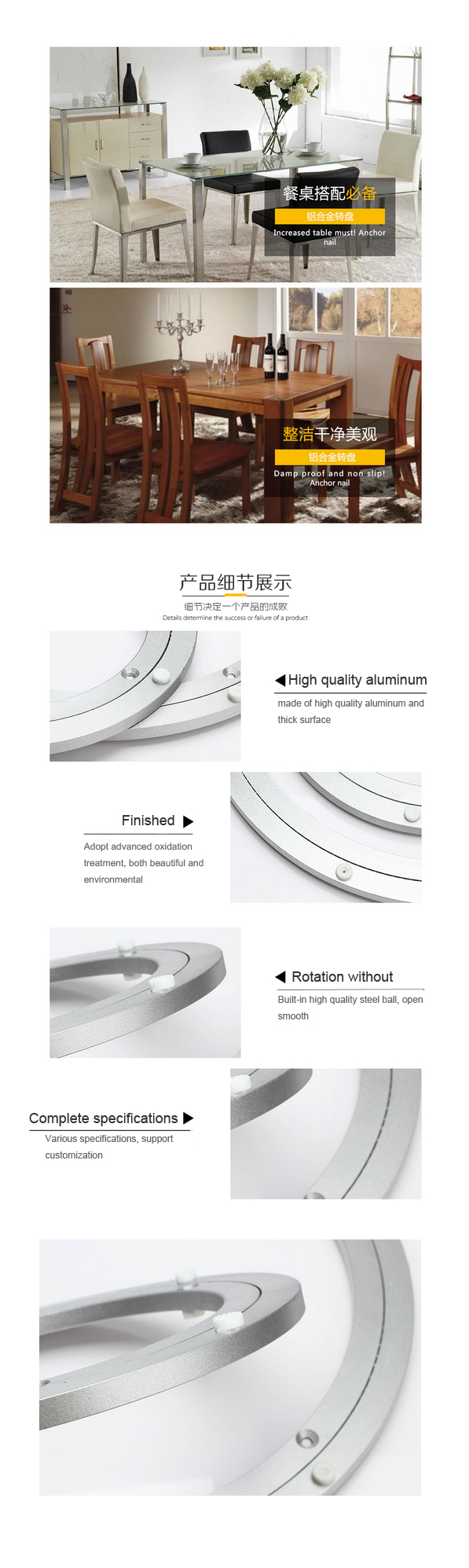 brand: KONLON and OEM color: silver port: Shanghai payment terms: L/C, Western Union, D/P, D/A, T/T, MoneyGram Package preview: Material: aluminum sample: usable Supply capacity: 50000 pieces per month MOQ: 1 item model: 14" turntable bearing lazy susan type: turntable feature: 360 degree rotation..... -