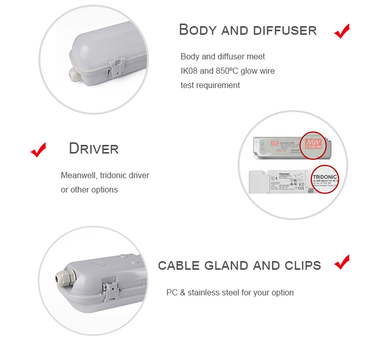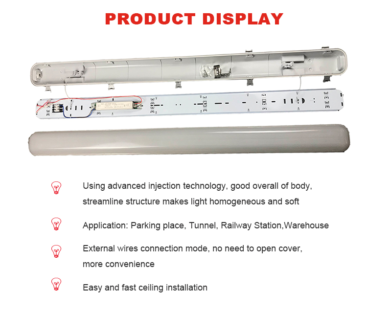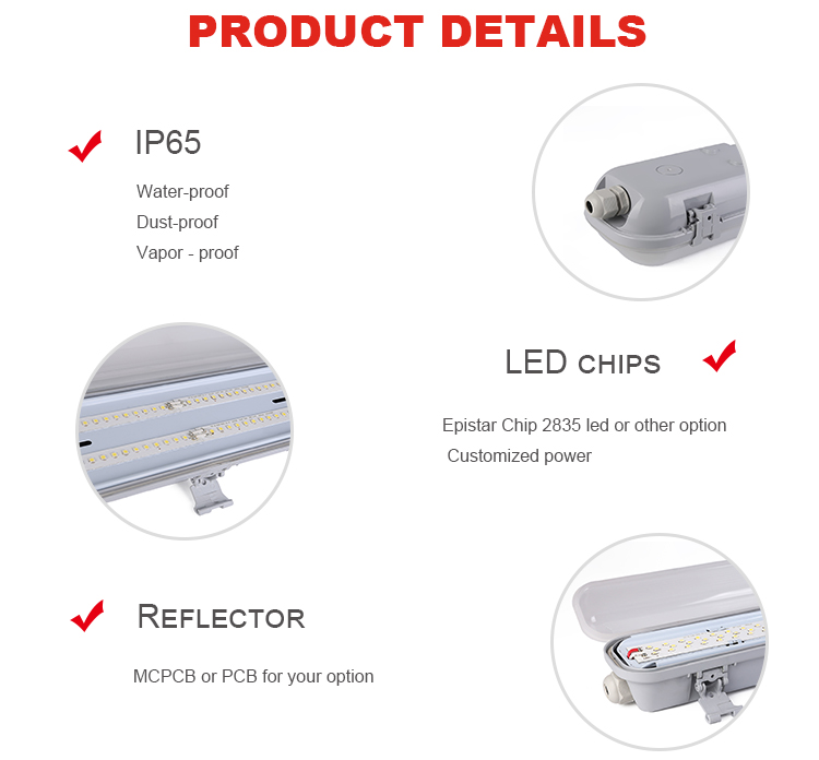 IP65 Waterproof Linear Light Strip Light 4ft 8ft 5 Year Warranty Tri-Proof Light Suitable for Packing Lot Product details Three-proof lighting 1. Fashionable and unique design, 270-degree beam angle.2. Built-in microwave motion sensor, only lights up when and where you need it. Connection method:...... -