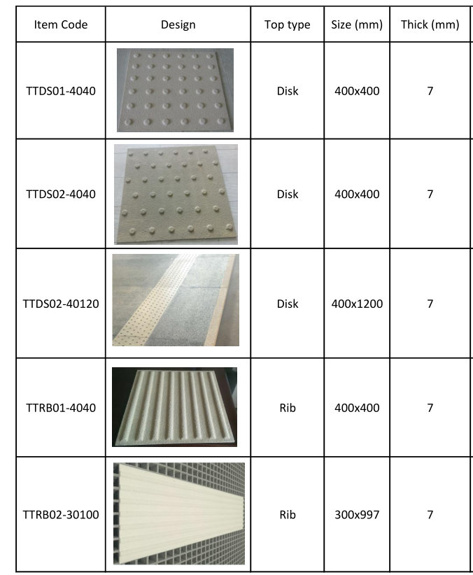 We have SS 316 and 304 Stainless Steel, Brass, Aluminum and PU, PVC Tactile Studs, Tactile Indicators, Fiberglass SMC and PU and Rubber Tactile Tiles:
